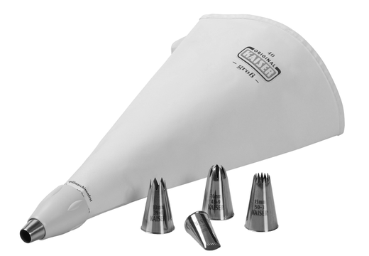 Von Muffins und Cupcakes über Kuchen, Torten und Plätzchen bis hin zu perfekt gespritztem Gebäck und außergewöhnlichen Kreationen: Mit dem 7-teiligen La Form Plus Spritzbeutel-Set von KAISER wird das Dekorieren, Garnieren und Spritzen von Gebäck jeder Art zum mühelosen Vergnügen. Spritzbeutel gefertigt aus strapazierfähigem und kochfestem Baumwollgewebe mit reinigungsfreundlicher, glatter Innenbeschichtung und vielfach wiederverwendbar. Ein Tüllen-Adapter sowie 5 Spritztüllen aus hochwertigem Edelstahl sind im Set enthalten.